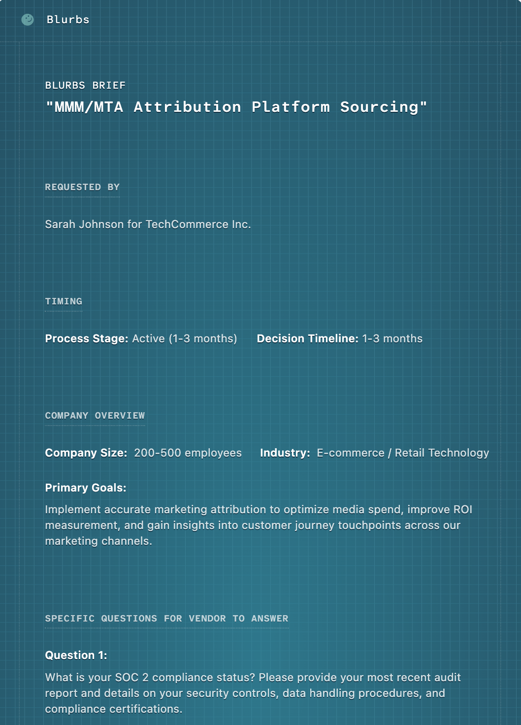 "After 25 years of MarTech evals I can tell you exactly where my time gets wasted. My team put together an anonymous Brief β vendors got our very pointed questions and detail about our business and the got back to us and made a short list without SDR email run-on."